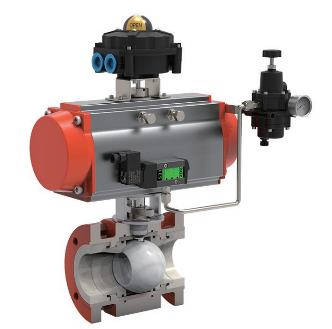 氣動耐磨陶瓷球閥V型球閥閥芯設(shè)計(jì)成帶有特殊開關(guān)的V型缺口,流通能力大,壓力損失小,并具有精確的截流特性和控制功能,流量特性為近似等百分比。啟閉件采用V型球缺結(jié)構(gòu),完全解決了閥腔易沉積介質(zhì)的